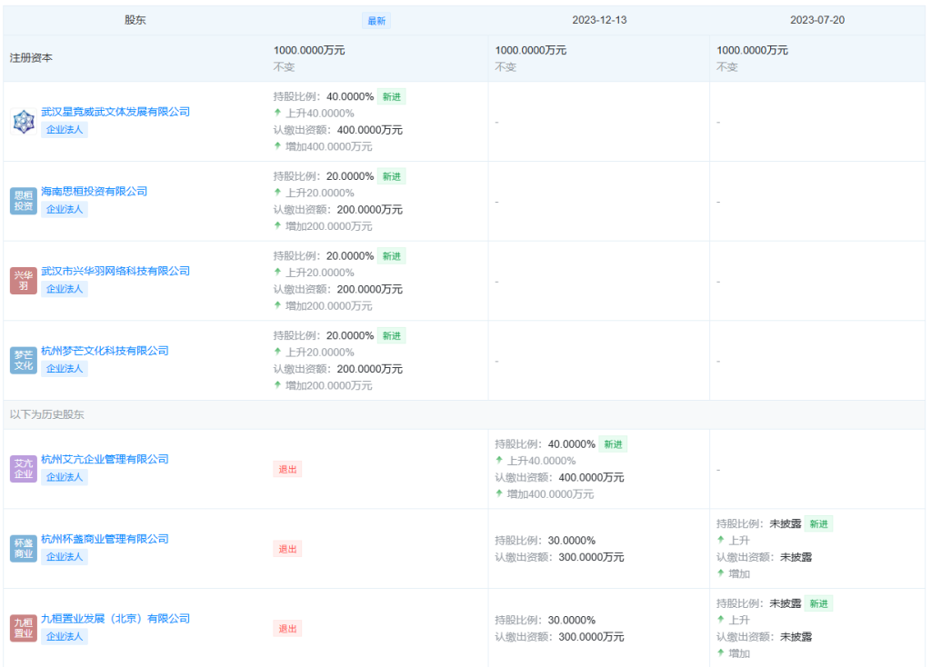 6月23日,澎湃新闻发现,这家2023年7月成立的寰聚商业在6月19日发生股权变动,原有股东全部退出,武汉星竞威武文体发展有限公司、武汉市兴华羽网络科技有限公司、杭州梦芒文化科技有限公司、海南思恒投资有限公司成为新股东,分别持股40%、20%、20%、20%。